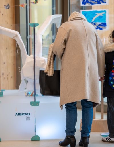 Lors de leur résidence au CEBC, les deux artistes ont été particulièrement impressionnés par la taille du grand albatros. Ils ont donc choisi de capter l’attention des visiteurs par une sculpture à taille réelle, attirant le regard sur l’envergure impressionnante de l’animal (pouvant atteindre 3,50 mètres). La sculpture est en papier épais, réalisée selon la méthode de l’origami. Ses pattes sont quant à elles réalisées en plastique grâce à l’impression 3D.