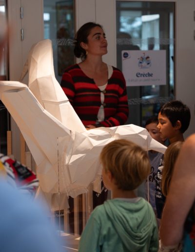 « L’idée de l’œuvre Albatros est née progressivement, à partir de la rencontre avec les chercheurs, qui nous ont énuméré toutes les choses exceptionnelles sur cet oiseau : le fait, par exemple, qu’il soit capable de voyager sur des milliers de kilomètres, pendant des années, sans toucher terre. Mais la chose la plus essentielle et impactante concernant cet animal à nos yeux, c’est sa taille. D’où notre idée d’arriver à attirer le regard et l’intérêt en représentant son envergure monumentale. Cela nous a fait découvrir et étudier de nouvelles pratiques. Nous avions déjà une expérience personnelle de l’Origami, et pliages papier, mais nous n’avions jamais utilisé ces techniques dans nos œuvres jusqu’à notre résidence pour le NANOmusée. » Mouawad + Laurier