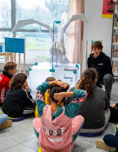 L’œuvre créée par les artistes représente un albatros grandeur nature qui donne à voir le rôle de sentinelle joué par les grands albatros.