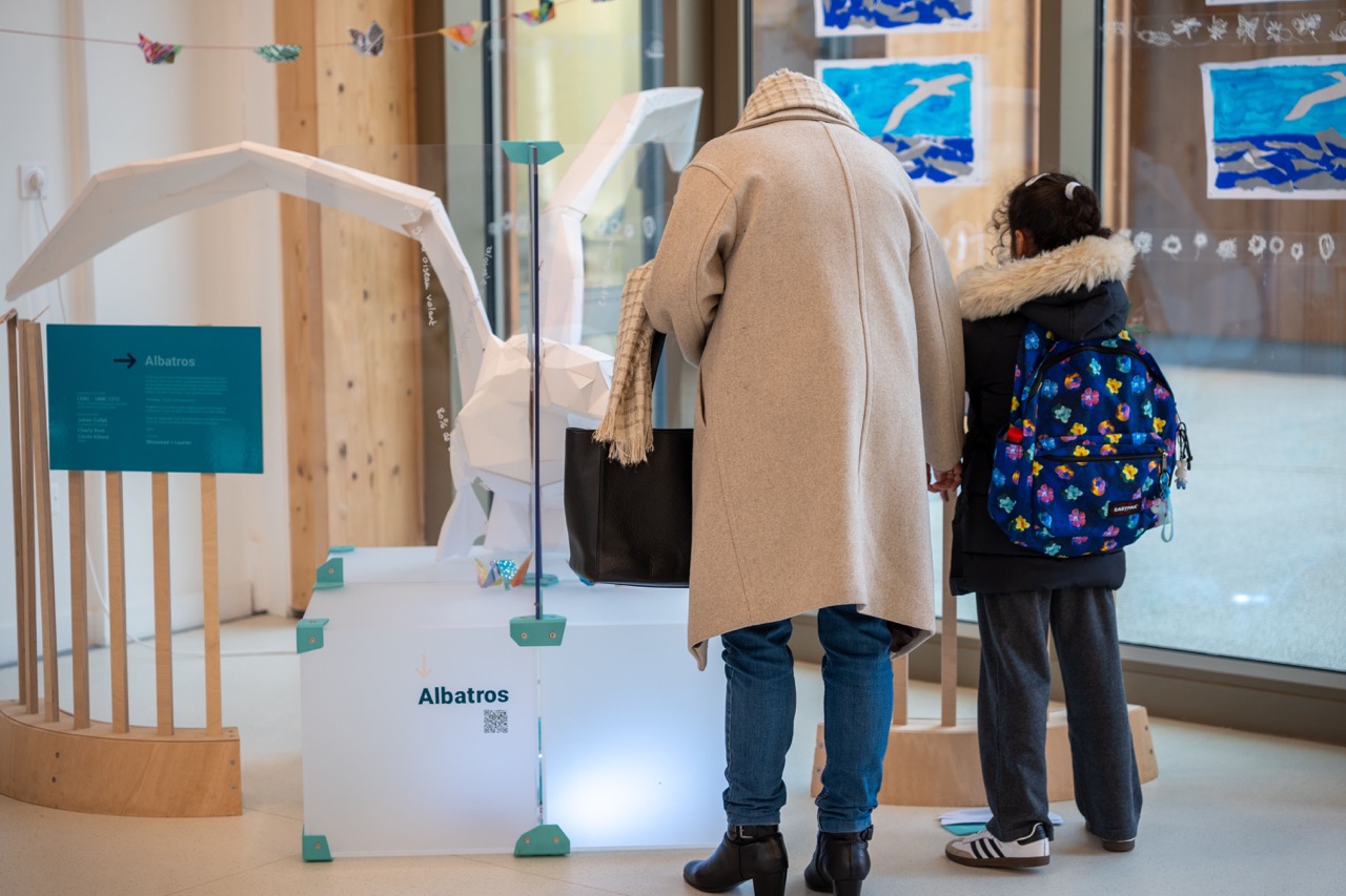 Lors de leur résidence au CEBC, les deux artistes ont été particulièrement impressionnés par la taille du grand albatros. Ils ont donc choisi de capter l’attention des visiteurs par une sculpture à taille réelle, attirant le regard sur l’envergure impressionnante de l’animal (pouvant atteindre 3,50 mètres). La sculpture est en papier épais, réalisée selon la méthode de l’origami. Ses pattes sont quant à elles réalisées en plastique grâce à l’impression 3D.