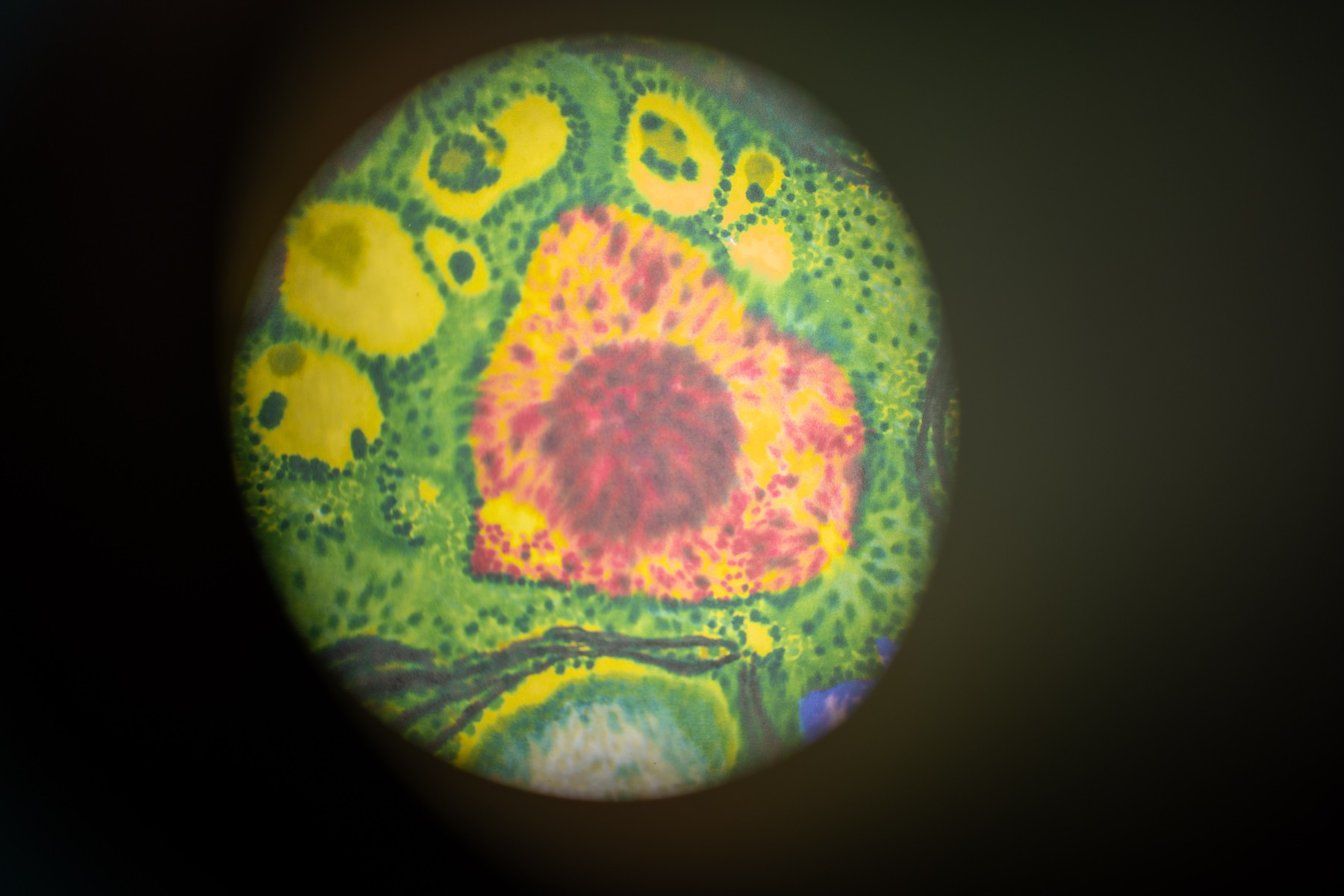 - Une plaque dessinée représentant son interprétation d’une cellule végétale d’algue, visible à travers la modélisation d’un microscope.